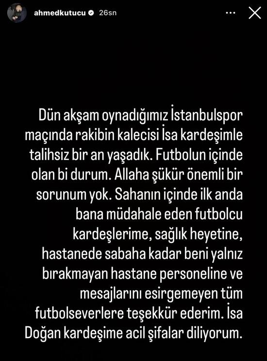 Galatasaray’da Ahmed Kutucu, Ziraat Türkiye Kupası’nda oynanan İstanbulspor maçında yaşanan bahtsız çarpışmanın akabinde toplumsal medya hesabından açıklamada bulundu.