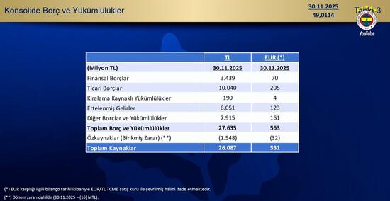 Fenerbahçe Kulübünün 30 Kasım 2025 prestijiyle borcunun 27 milyar 635 milyon lira olduğu açıklandı.