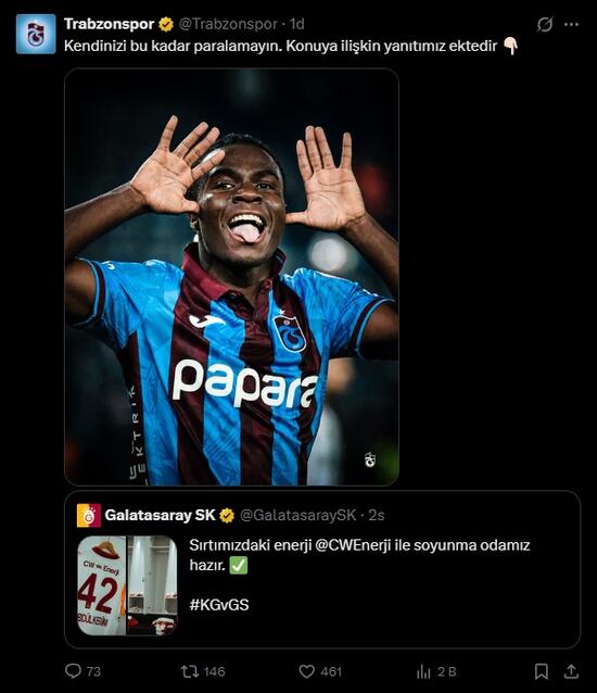 Trabzonspor ise bu paylaşımı alıntıladı. Bordo-mavililer, yaptığı paylaşımda, “Kendinizi bu kadar paralamayın. Hususa ait cevabımız ektedir.” sözlerini kullandı ve kadroda 42 numarayı giyen Oulai’nin fotoğrafını paylaştı.